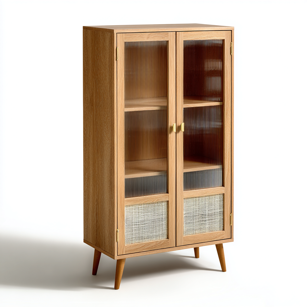 Realizzati in legno con elementi in vetro e rattan, caratterizzati da finitura naturale uniforme. La lavorazione accurata garantisce una struttura stabile e superfici adatte all'uso quotidiano.