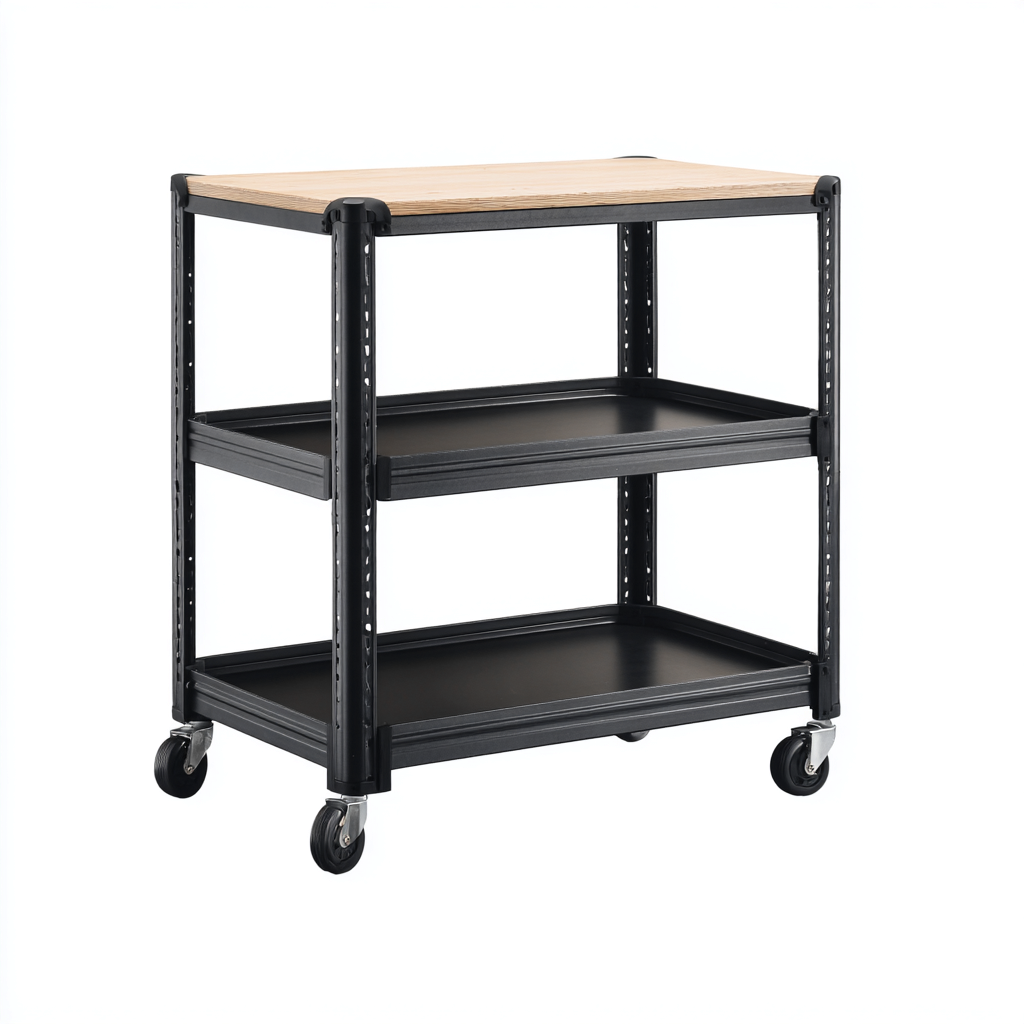 Carrello da cucina con struttura robusta e linee essenziali, progettato per supportare attivita di preparazione e organizzazione. Il piano superiore offre una superficie stabile mentre i ripiani inferiori facilitano la gestione ordinata degli accessori.