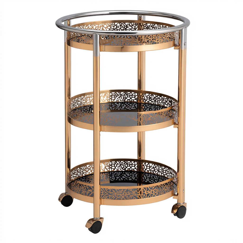 Carrello da cucina dal design raffinato e contemporaneo, pensato per supportare le attivita di servizio e organizzazione all'interno dell'ambiente cucina. La forma rotonda e la struttura slanciata permettono un utilizzo pratico mantenendo un aspetto decorativo ed equilibrato.