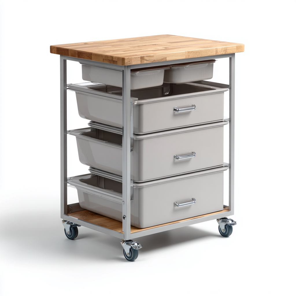 Progettata con elementi contenitivi estraibili e piano superiore funzionale, permette di organizzare utensili e accessori in modo ordinato e immediatamente accessibile. La base su ruote facilita lo spostamento all'interno della cucina.