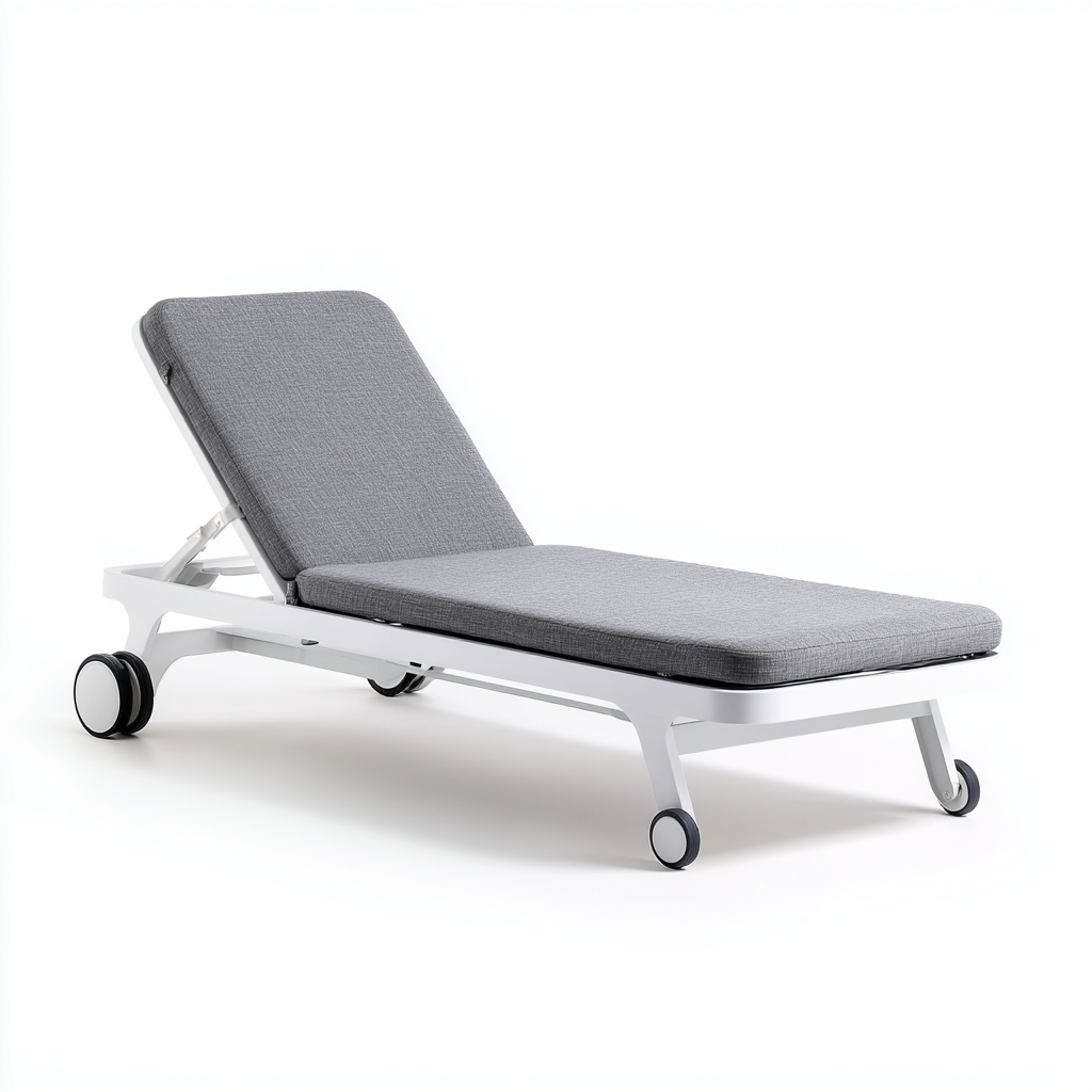 La struttura è realizzata in alluminio con finitura bianca, adatta all'uso esterno. La superficie di appoggio è rivestita in tessuto di colore grigio chiaro con imbottitura uniforme, progettata per garantire comfort e stabilità.