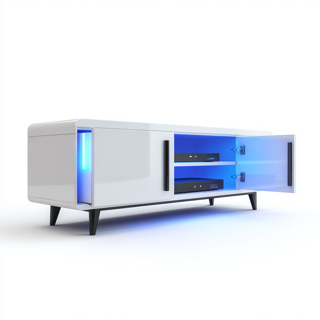 Il piano superiore offre una superficie stabile per il televisore. Lo spazio interno consente di collocare dispositivi multimediali in modo ordinato, mentre l'illuminazione integrata migliora la visibilità e l'impatto visivo del mobile.