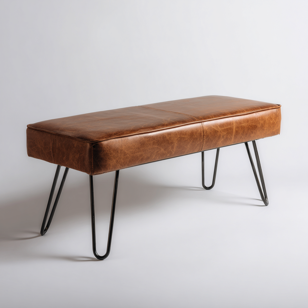 La struttura portante è realizzata in metallo con finitura nera, abbinata a una seduta rivestita in pelle di colore marrone. La lavorazione garantisce una buona solidità e una superficie di seduta uniforme.