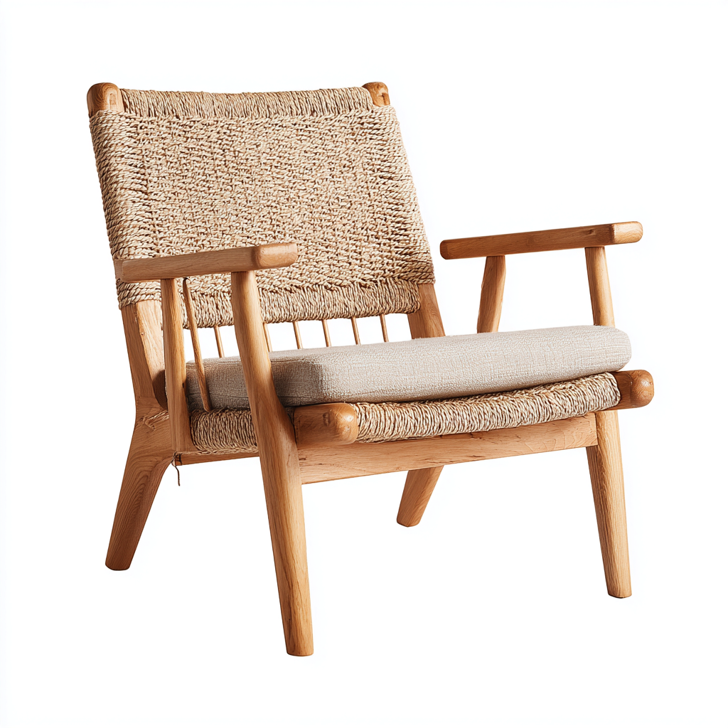La struttura portante è realizzata in legno con finitura naturale, lavorato per garantire solidità e stabilità. La seduta e lo schienale sono realizzati in fibra intrecciata con trama compatta, integrata con precisione nel telaio.