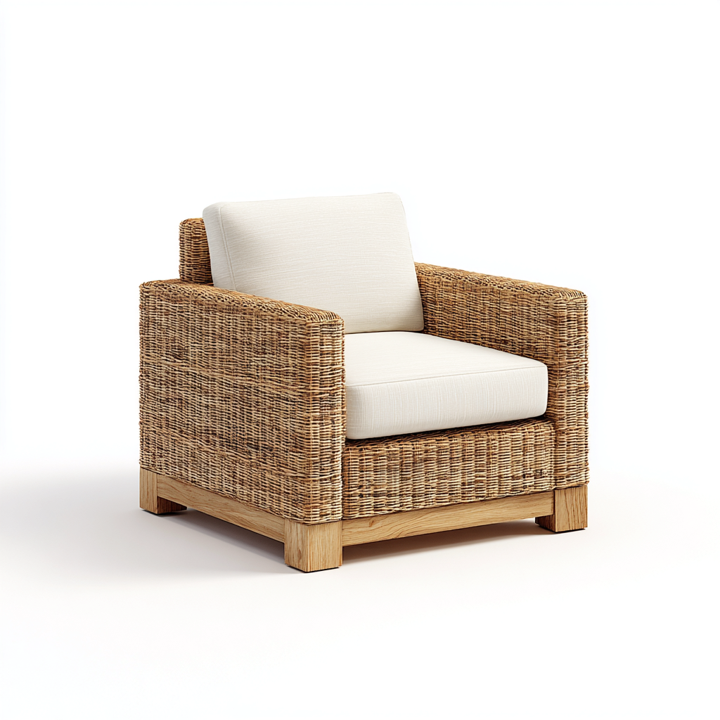 La struttura è realizzata in legno con finitura naturale, progettato per garantire stabilità e durata. Il rivestimento esterno è in rattan intrecciato con trama fitta e uniforme, integrato nella base e nei braccioli per una resa compatta.