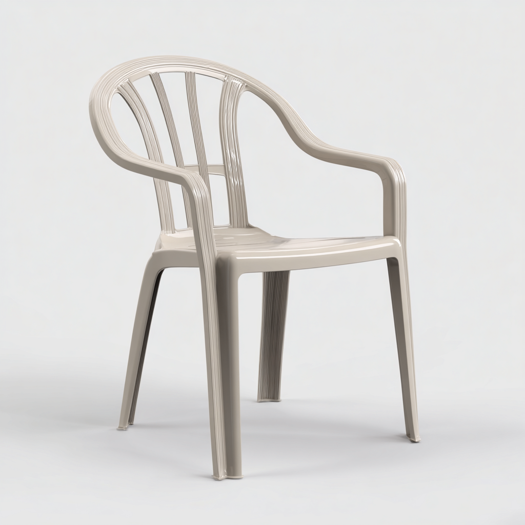 Realizzata interamente in plastica, la poltrona offre una superficie liscia e uniforme. La struttura monoblocco garantisce stabilità e una buona resistenza all'uso quotidiano in ambienti esterni.
