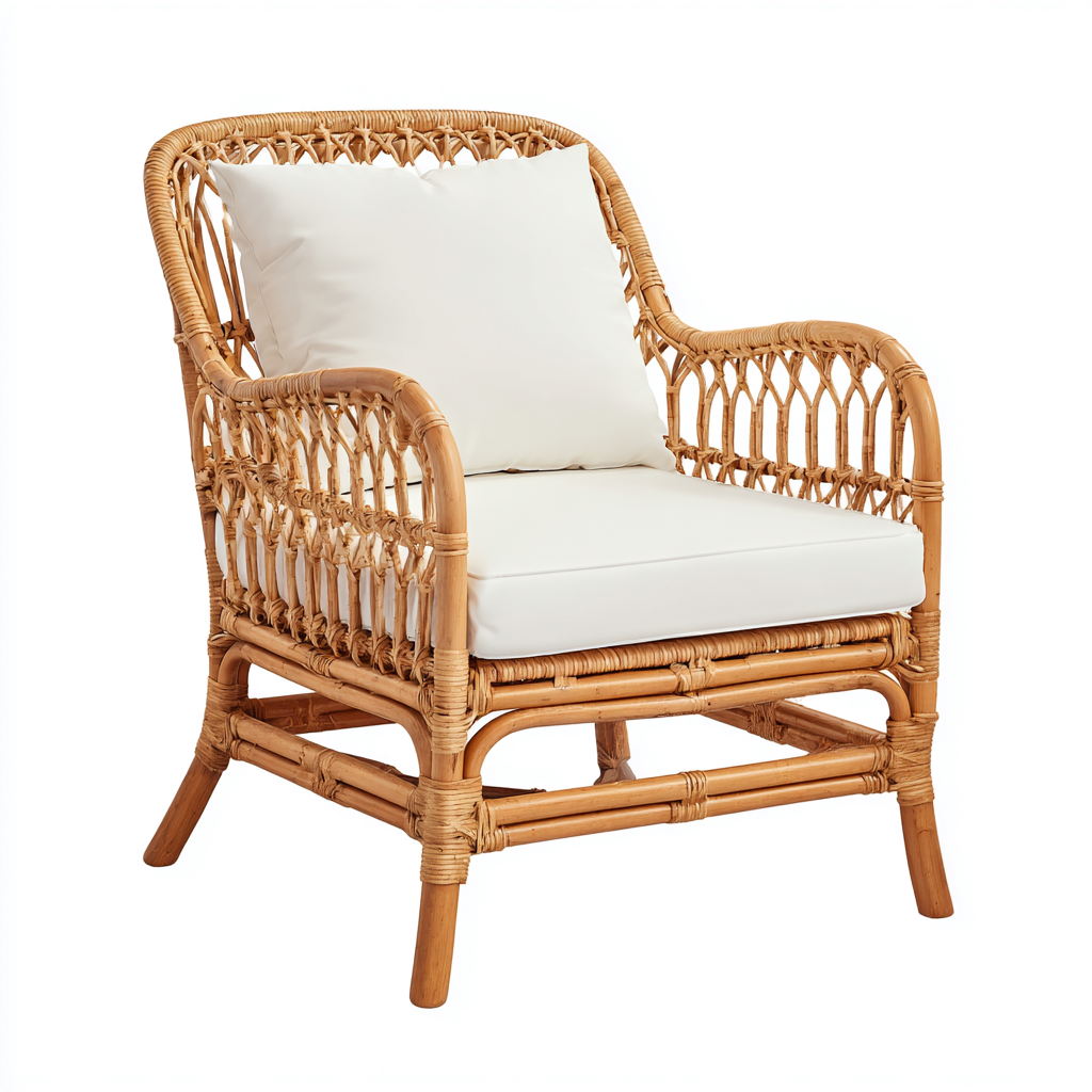 La struttura è realizzata in rattan intrecciato con finitura naturale, lavorato con una trama regolare e continua. Il telaio di supporto è in legno coordinato, progettato per garantire stabilità e resistenza all'uso esterno.