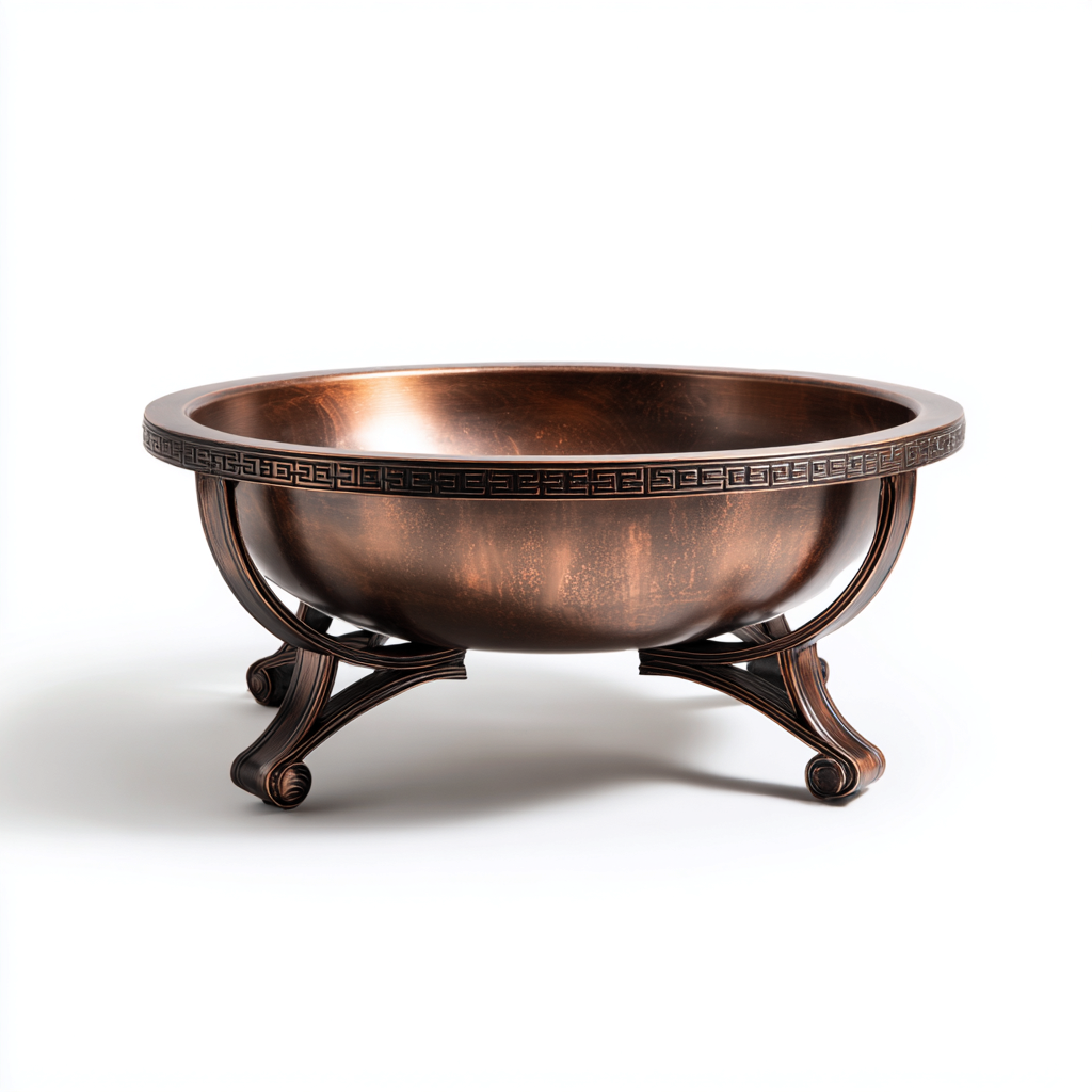 Il braciere è realizzato in metallo con finitura color rame dall'aspetto caldo e materico. La vasca liscia è sostenuta da una struttura con supporti curvati, progettata per garantire stabilità e resistenza durante l'utilizzo all'esterno.