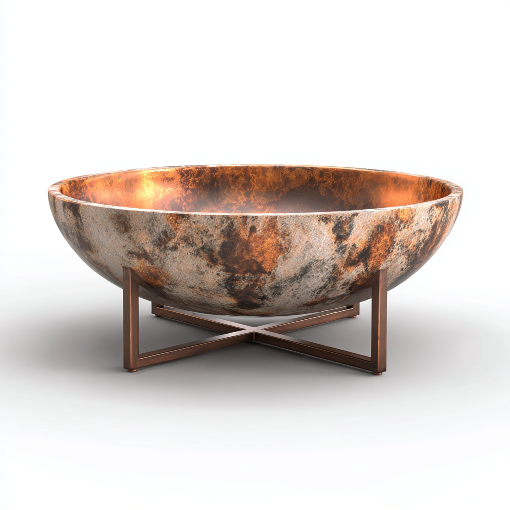 La struttura è realizzata in metallo con superficie color rame dall'aspetto materico. Il bacino emisferico è supportato da una base metallica incrociata che garantisce stabilità e una corretta distanza dal suolo durante l'utilizzo.