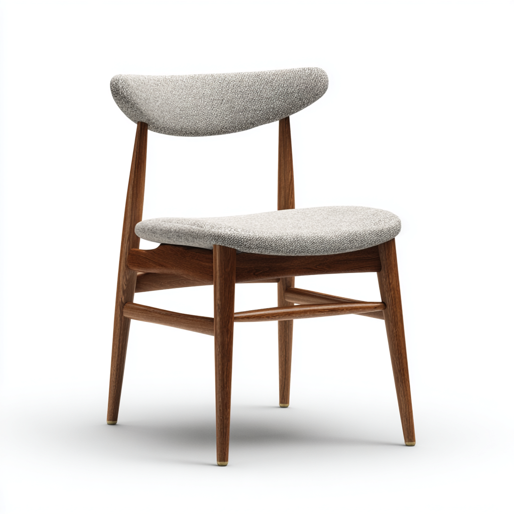 La struttura è realizzata in legno con finitura color noce che mette in risalto la venatura naturale. La seduta e lo schienale sono rivestiti in tessuto di colore grigio chiaro con imbottitura integrata, studiata per il comfort quotidiano.