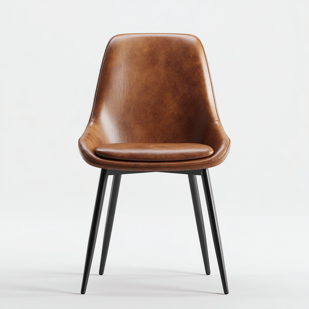 La seduta e lo schienale sono rivestiti in pelle di colore marrone con imbottitura integrata. La struttura portante è realizzata in metallo con finitura nera, garantendo stabilità e resistenza nell'uso quotidiano.