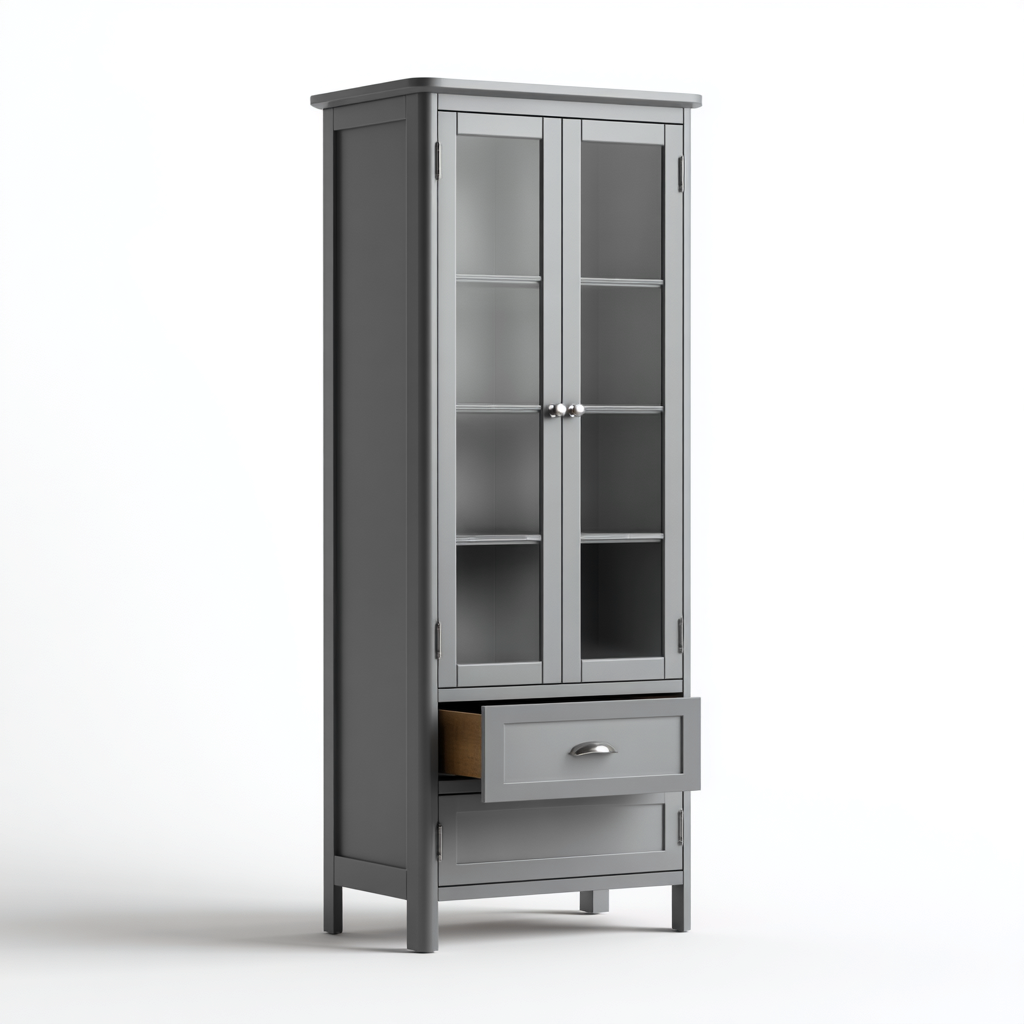 Struttura realizzata in legno e vetro con finitura grigio uniforme. L'assemblaggio accurato assicura stabilita e una resa estetica coerente con arredi moderni.
