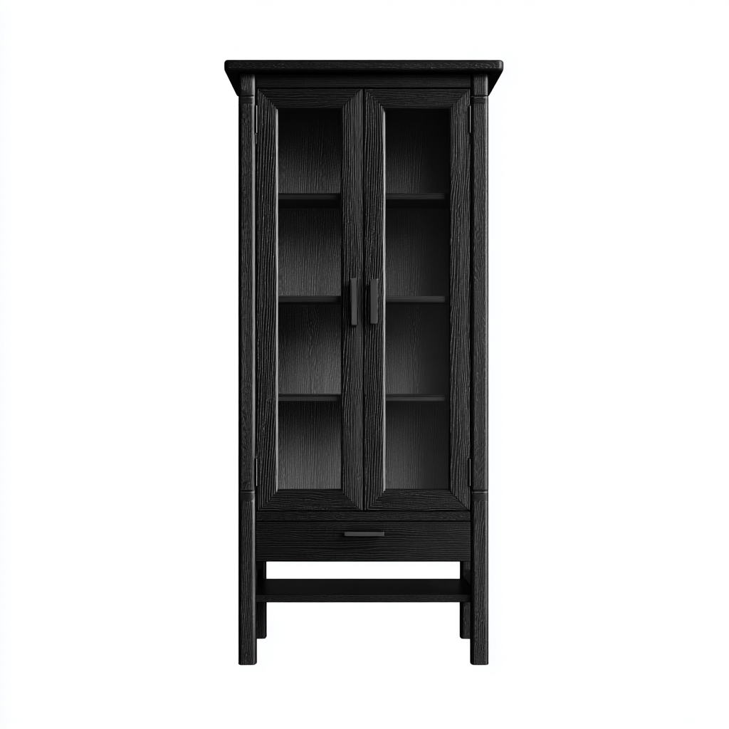 Struttura realizzata in legno e vetro con finitura nera uniforme. La lavorazione accurata assicura una superficie solida e una buona resistenza all'uso quotidiano, mantenendo un aspetto sobrio ed elegante.